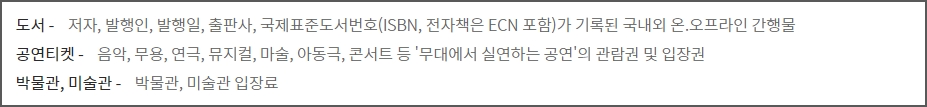 도서 구입 및 공연관람, 박물관 및 미술관 입장하기 위해 사용한 금액을 최대 100만원까지 추가 공제해줍니다. 공제율은 30%가 적용이 됩니다. 신용카드 공제율은 15%이므로 2배 더 공제를 해주는 효과가 있습니다.