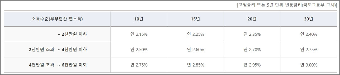 부부합산 연소득이 연가 6천만원 이하여야 합니다. 다만, 생애 최초 주택 구입자, 신혼부부, 2자녀 이상 가구에 해당하는 경우는 1천만원 더 많은 연간 7천만원 이하면 해당이 됩니다.