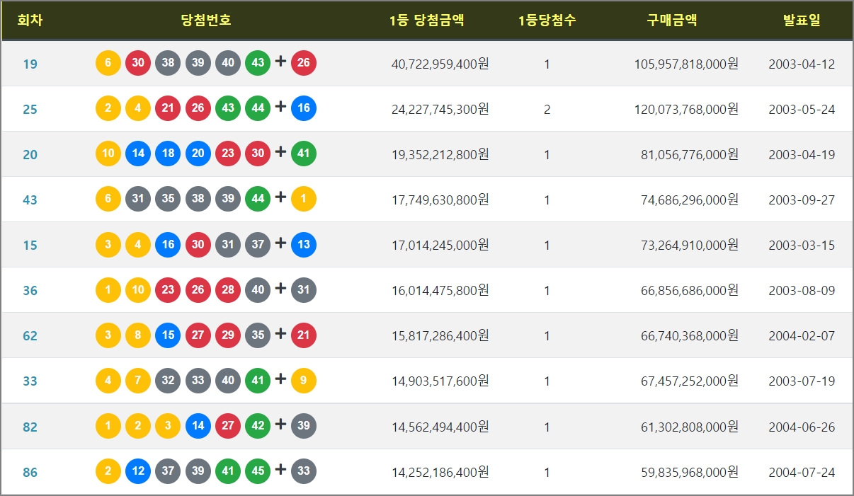 지금까지 로또 1등 최고 당첨금액은 400억 정도입니다. 그 다음은 242억, 193억정도가 됩니다. 1게임당 2천원할때 최고금액이 나왔습니다. 이때는 이월도 간간히 있어서 당첨금액이 굉장히 컸습니다. TV에서 출연자들이 실시간으로 로또를 맞추던 기억도 납니다. 그 때는 정말 로또 광풍이었습니다.