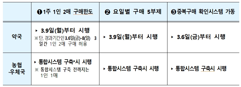 우체국, 농협 하나로마트는 3월 6일부터 시행되며 1인 1매 구입 가능합니다. 약국이 없는 읍면 중심으로 판매를 합니다. 다만, 중복구매확인시스템으로 통합 이후에는 1인 2매 구입할 수 있습니다. 대형마트나 편의점에서는 구매하기 어려울 수 있습니다.