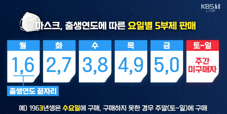 출생연도의 마지막 자리 숫자가 1과 6이면 월요일, 2와 7이면 화요일, 3과 8이면 수요일, 4와 9이면 목요일, 5와 0이면 금요일에만 1인당 2매씩 마스크를 구매할 수 있습니다. 1주일에 최대 2매 구매가 가능합니다. 주간에 구매하지 못한 분들은 토요일과 일요일에 구매할 수 있습니다. 해당 주에 구매하지 못한 마스크는 다음주로 이월되지 않습니다. 즉, 해당 주에 2매를 못 사더라도 다음주에도 2매 밖에 살 수 없습니다. 4매를 구매할 수 없습니다. 주의할 점은 주민등록번호 끝자리가 아닙니다. 출생연도입니다.