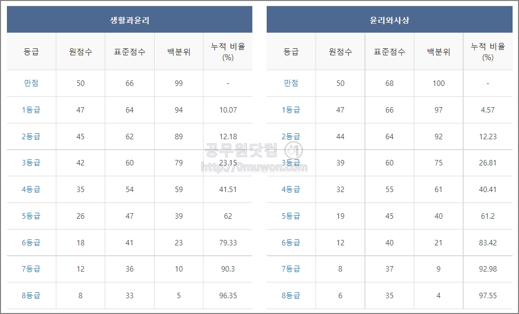 ▼ 생활과 윤리 등급컷, 윤리와사상 등급컷