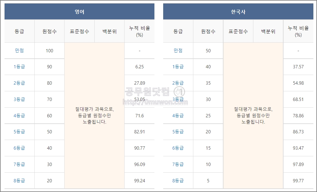 영어, 한국사는 절대평가 과목으로 등급별 원점수만 노출이 됩니다.
