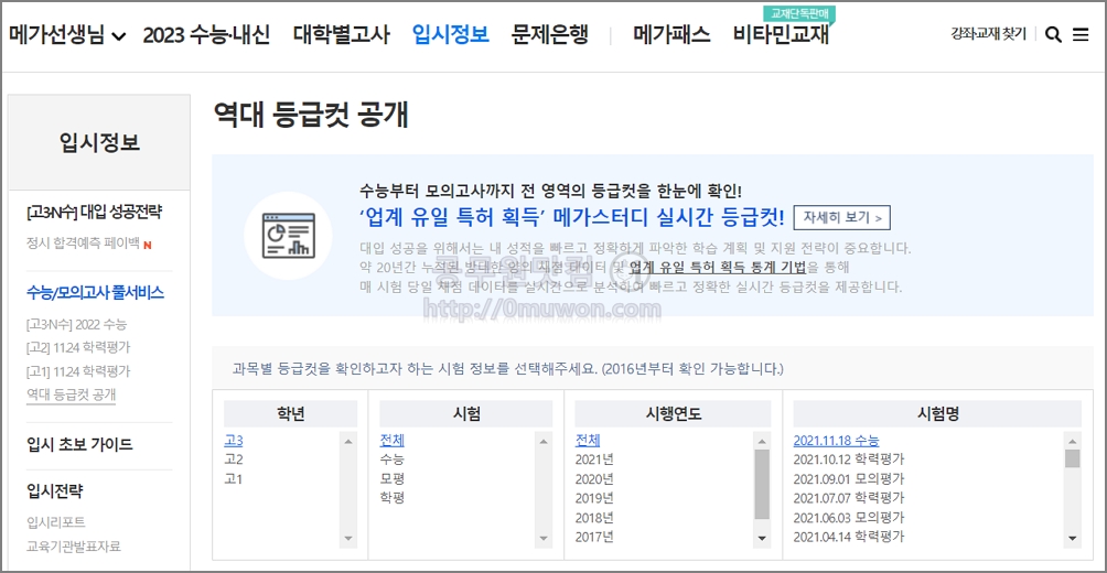 메가스터디 홈페이지 접속을 한 후 상단 메뉴에서 "입시정보"를 클릭합니다. 화면 왼쪽의 메뉴에서 "역대 등급컷 공개" 를 클릭합니다. 바로 아래의 바로가기를 클릭하면 해당 페이지로 이동을 합니다. ▼ 등급컷 바로가기