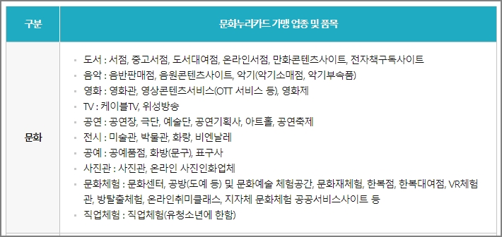 오늘은 삶의 질 향상과 문화격차 완화를 위해 기초생활수급자, 차상위계층을 대상으로 문화예술, 국내여행, 체육활동을 지원하는 문화누리카드의 사용처에 대해서 살펴보았습니다. 문화누리카드 사용에 참고하세요.