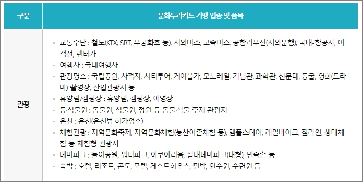 오늘은 삶의 질 향상과 문화격차 완화를 위해 기초생활수급자, 차상위계층을 대상으로 문화예술, 국내여행, 체육활동을 지원하는 문화누리카드의 사용처에 대해서 살펴보았습니다. 문화누리카드 사용에 참고하세요.