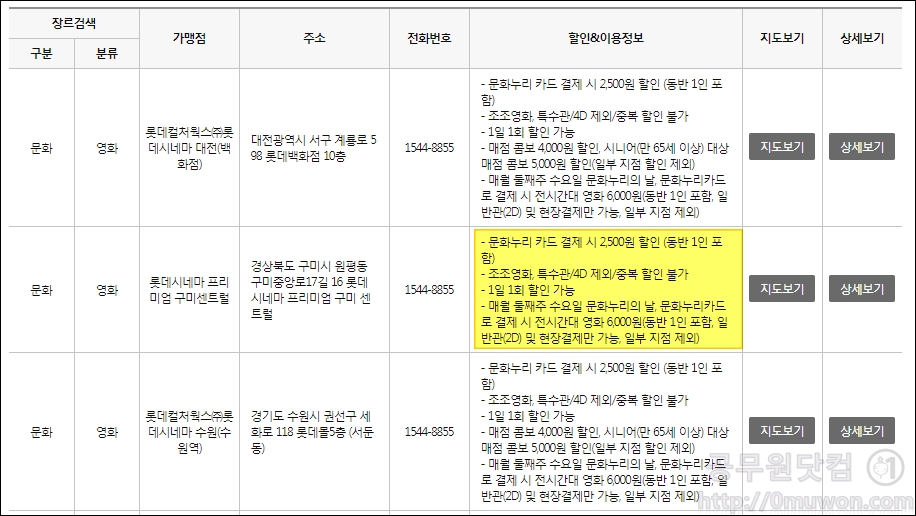 문화누리카드로 할인 가능한 영화관은 CGV, 롯데시네마, 메가박스입니다. 문화누리카드로 결제 시 2500원 할인이 됩니다. 통신사 멤버십과는 중복할인은 불가합니다. 영화관에 따라 혜택이 조금 차이는 있을 수 있습니다.