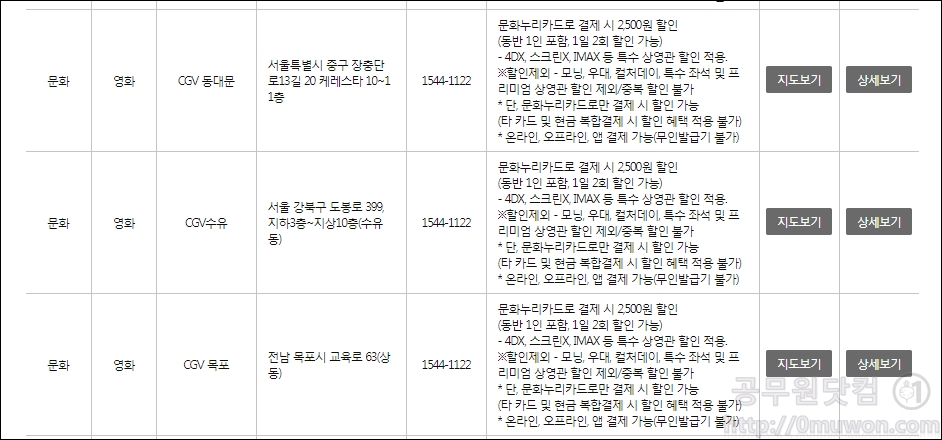 문화누리카드로 할인 가능한 영화관은 CGV, 롯데시네마, 메가박스입니다. 문화누리카드로 결제 시 2500원 할인이 됩니다. 통신사 멤버십과는 중복할인은 불가합니다. 영화관에 따라 혜택이 조금 차이는 있을 수 있습니다.