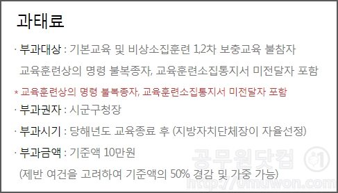 민방위 교육 대상자임에도 별도의 연기 사유없이 단 한번도 교육을 받지 않게 되면 과태료를 납부해야 합니다. 기본교육 및 비상소집훈련 1차, 2차 보충교육 불참자, 교육훈련상의 명령 불복종자, 교육훈련소집통지서 미전달자 등에게는 과태료 10만원이 부과가 됩니다. 과태료는 제반 여건을 고려하여 기준액의 50% 경감 및 가중이 가능합니다.