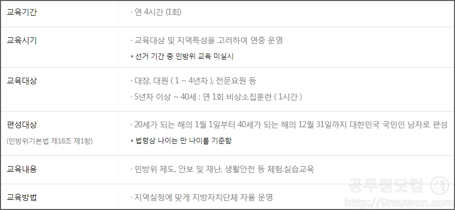 민방위 대원 편성대상은 만 20세가 되는 해의 1월 1일부터 만 40세가 되는 해의 12월 31일까지 대한민국 국민인 남자로 편성이 되며, 민방위 제도, 안보 및 재난, 생활안전 등 체험, 실습교육을 합니다. 여자의 경우는 민방위 훈련 의무대상이 아닙니다.