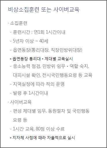 교육기간은 1~4년차 대원은 연 1회 4시간, 5년차 이상 만 40세 이하는 연 1회 비상소집훈련 1시간입니다. 5년차 이상 대원은 사이버 교육이 가능합니다.