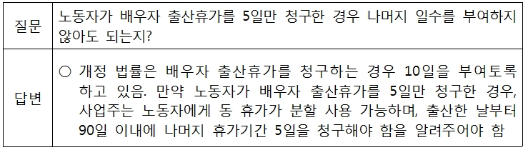 배우자 출산휴가를 청구하는 경우 10일을 부여하여야 합니다. 만약 배우자 출산휴가를 5일만 청구한 경우에는, 사업주는 노동자에게 출산휴가가 분할 사용 가능하며, 출산한 날부터 90일 이내에 나머지 휴가기간 5일을 청구해야 함을 알려주어야 합니다.