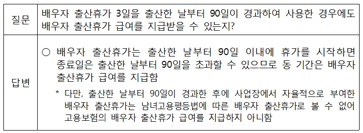 다만, 출산한 날부터 90일이 경과한 후에 사업장에서 자율적으로 부여한 배우자 출산휴가는 남녀고용평등법에 따른 배우자 출산휴가로 볼 수 없어 고용보험의 배우자 출산휴가 급여를 지급하지 아니합니다.