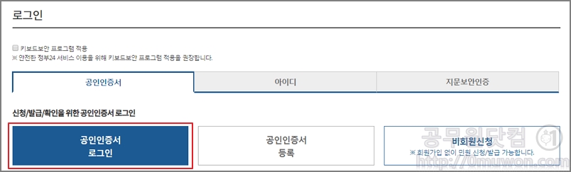 ▼ 본인확인이 필요한 서비스 이므로, 로그인을 합니다. 비회원으로는 발급이 불가합니다. 공인인증서가 등록되어 있는 경우 공인인증서 로그인을 합니다. 정부24 홈페이지는 민원서류 신청을 위해서는 꼭 필요하므로 공인인증서등록 후 사용하시면 매우 편리합니다.