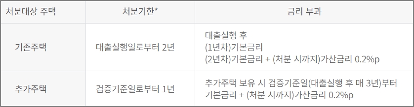 주의할 것은 본인 또는 배우자(결혼예정자 및 세대분리된 배우자 포함)가 분양권, 입주권을 보유하고 있거나, 주택을 지분으로 보유한 경우에도 주택보유 수에 포함이 됩니다. 기존주택 또는 추가주택을 처분기한 내에 처분하지 않거나, 주택소유에 대한 확약내용이 사실과 다른 것으로 확인된 경우에는 기한이익이 상실됩니다.