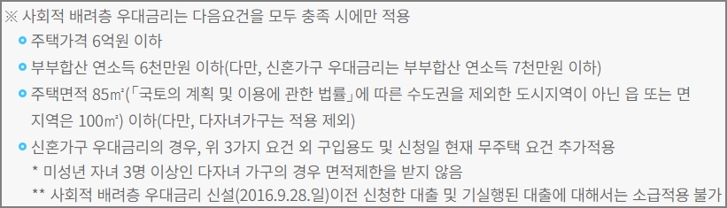 한부모가구, 장애인가구, 다문화가구, 다자녀가구는 각 항목별로 0.4%p 우대금리가 적용됩니다. 신혼가구는 0.2%p 금리우대가 가능합니다. 우대금리 중 2가지 선택할 수있으며, 최대 0.8%p를 한도로 중복적용이 가능합니다. 사회적 배려층 우대금리는 아래 조건을 모두 만족해야 가능합니다.
