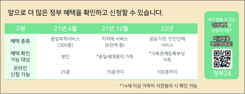 앞으로 보조금24를 통해 더 많은 혜택을 확인하고 신청할 수 있습니다. 2021년에는 305종이지만, 2021년 12월에는 6천여종까지 신청이 가능합니다. 그리고 2022년에는 공공기관 및 민간단체 서비스도 이용이 가능해집니다.
