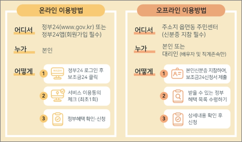 온라인으로는 정부24에 로그인 후 보조금24 클릭 후 이용을 할 수가 있습니다.