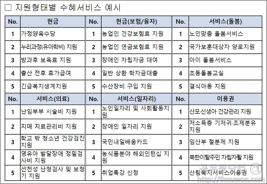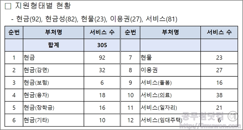 지원형태별로 현금지원 92가지, 현금성 지원 82가지, 현물 23종류, 이용권 27, 서비스 81개가 있습니다.