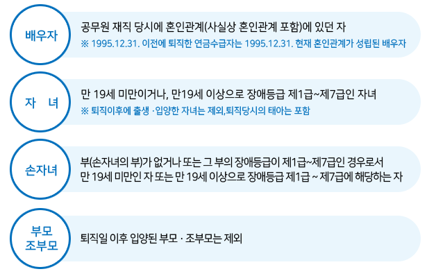유족은 퇴직연금수급자(공무원) 사망 당시 부양되고 있던 사람이어야 합니다. 배우자는 공무원 재직 당시에 혼인관계(사실상 혼인관계 포함)에 있던자이어야 합ㄴ다. 1995년 12월 31일 이전에 퇴직한 연금수급자는 1995년 12월 31일 현재 혼인관계가 성립된 배우자입니다. 자녀는 만 19세 미만이거나, 만 19세 이상으로 장애등급 제1급~제7급인 자녀입니다. 퇴직이후에 출생 또는 입양한 자녀는 제외됩니다. 단 퇴직당시 태아는 자녀의 범위에 포함됩니다. 손자녀는 부(손자녀의 부)가 없거나 그 부의 장애등급이 제1급~제7급인 경우로서 만 19세 마만인 자 또는 만 19세 이상으로 장애등급 제1급~제7급에 해당하는 자 이어야 합니다. 부모, 조부모는 퇴직일 이후 입양되 부모, 조부모는 제외됩니다.
