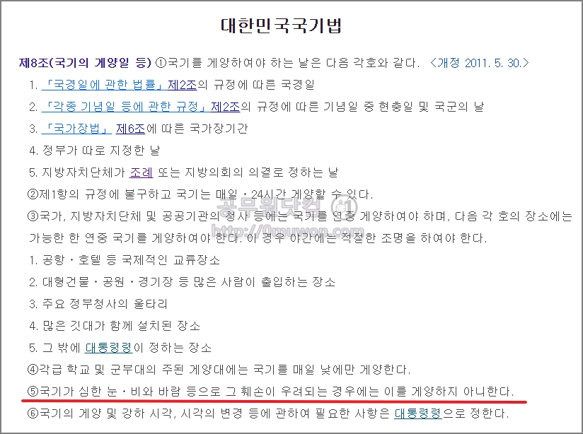 해당 법에는 비 오는 날 등에 대한 방법도 있습니다. 대한민국 국기법 제8조 제5항에 있습니다. 해당 법에 따라 심한 눈이나 비와 바람 등으로 태극기 훼손이 우려되는 경우에는 게양하지 않습니다.