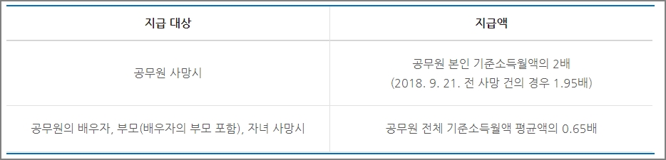▶ 지급액은 공무원 본인인 사망한 경우에는 사망 당시 공무원 본인 기준소득월액의 2배(2018. 9.21. 전 사망 건의 경우 1.95배), 공무원의 배우자, 부모(배우자의 부모포함), 자녀가 사망한 경우에는 사망 당시 공무원 전체 기준소득월액 평균액의 0.65배입니다.