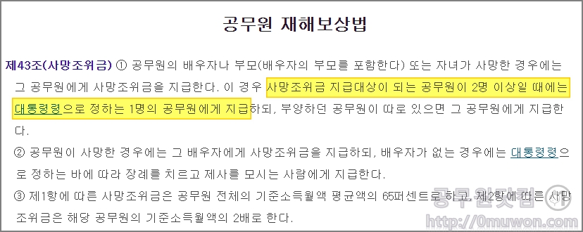 ② 공무원의 배우자, 부모(배우자의 부모포함), 자녀 : 사망 당시 공무원 전체 기준소득월액 평균액의 0.65배