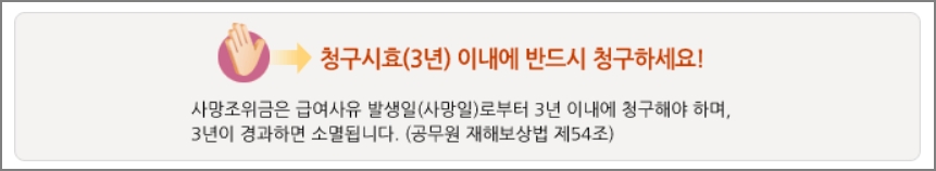 ▶ 사망조위금은 사망일로부터 3년 이내에 청구하셔야 합니다. 청구권 소멸시효는 채권, 채무관계를 조기에 확정하고 법률상태 미확정에 따른 법적 불안정성을 제거하기 위해 불가피하게 운영하는 제도이므로 청구인의 부조급여 지급제도 미숙지로 청구하지 못한 경우에도 일단 소멸시효가 지나면 청구권이 소멸되어 급여를 지급받을 수 없으니 유의하여 주시기 바랍니다.