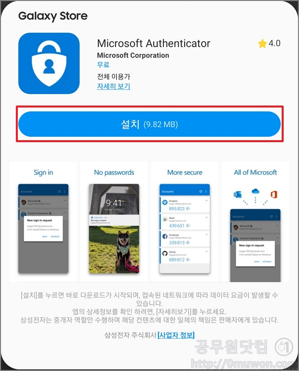 ▼ 갤럭시 스토어에서 설치 버튼을 클릭합니다. 설치를 누르면 자동으로 다운로드가 됩니다. 접속된 네트워크에 따라 데이터 통화료가 발생할 수 있습니다.