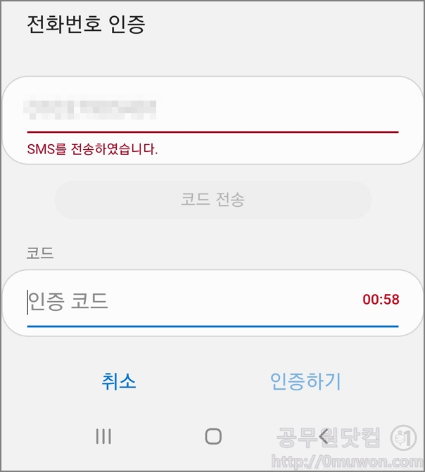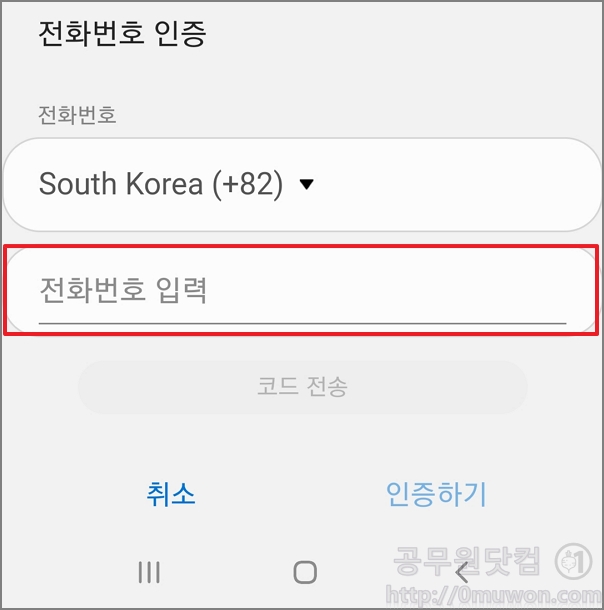 ▼ 전화번호 인증을 합니다. 본인 전화번호를 입력하고 코드를 전송합니다. 문자로 온 인증코드 6자리를 입력한 후 인증하기 버튼을 클릭합니다.