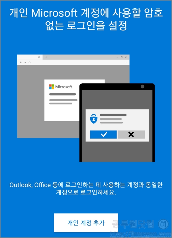 ▼ 개인 Microsoft 계정에 사용할 암호 없는 로그인을 설정합니다. Outlook, Office 등에 로그인하는데 사용하는 계정과 동일한 계정으로 로그인하세요.