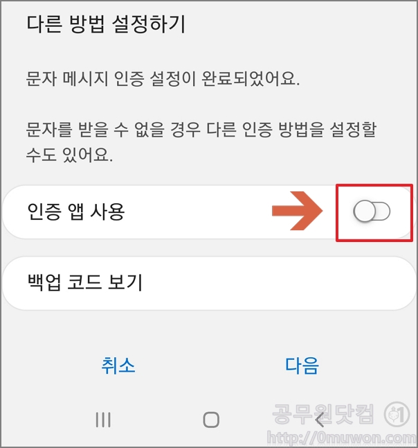 ▼ 문자 메시지 인증 설정이 완료되었습니다. 다른 방법으로 설정하여 추가 인증 방법입니다. 문자를 받을 수 없을 경우 다른 인증 방법을 설정할 수도 있습니다. 인증 앱 사용을 클릭하여 활성화합니다.