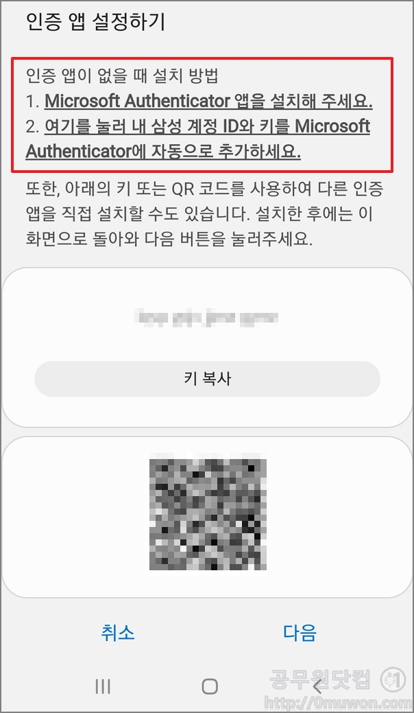 1. Microsoft Authenticator 앱을 설치해 주세요. 2. 여기를 눌러 내 삼성 계정 ID와 키를 Microsoft Authenticator에 자동으로 추가하세요. 설치한 이후에는 화면으로 돌아와 다음 버튼을 눌러주세요.