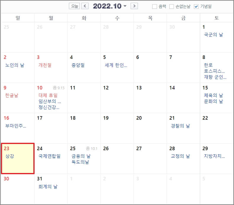 오늘은 24절기 중 상강에 대해서 알아보았습니다. 올해도 얼마 남지 않았습니다. 남은 기간 잘 마무리하시고, 건겅에 유의하시기 바랍니다.