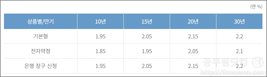 기본형의 경우 10년은 1.95% 30년은 2.2%입니다. 전자약정을 이용하면 대출기간 10년은 1,85%, 30년은 2.1%가 됩니다. 은행창구로 신청하면 기본형과 동일합니다. 한국주택금융공사를 통해 신청하는게 유리합니다.