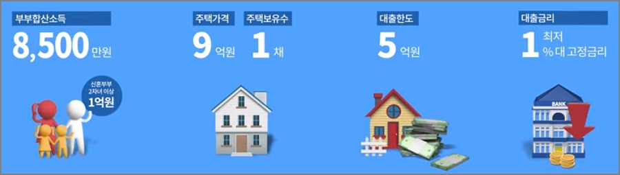 소득의 경우 부부합산 연소득이 8500만원 이하여야 합니다. 미혼은 본인소득기준이며, 기혼인 경우는 부부합산기준입니다. 다만, 혼인기간 7년 이내의 신혼부부 및 2자녀 이상 가구는 부부합산 1억원 이하까지 해당이 됩니다. 2자녀는 만 19세 미만 자녀만 해당이 됩니다.