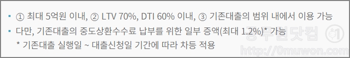 대출은 기존대출의 대출잔액 및 중도상환수수료 범위 내에서 최대 5억원까지 대출이 됩니다. LTV 70%, DTI 60%를 적용하되, 기존대출 상환을 위한 중도상환수수료(최대 1.2%)만큼은 증액 가능합니다. 대출기간은 10년, 15년 20년, 30년입니다.