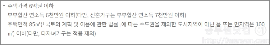소득의 경우 부부합산 연소득이 8500만원 이하여야 합니다. 미혼은 본인소득기준이며, 기혼인 경우는 부부합산기준입니다. 다만, 혼인기간 7년 이내의 신혼부부 및 2자녀 이상 가구는 부부합산 1억원 이하까지 해당이 됩니다. 2자녀는 만 19세 미만 자녀만 해당이 됩니다.