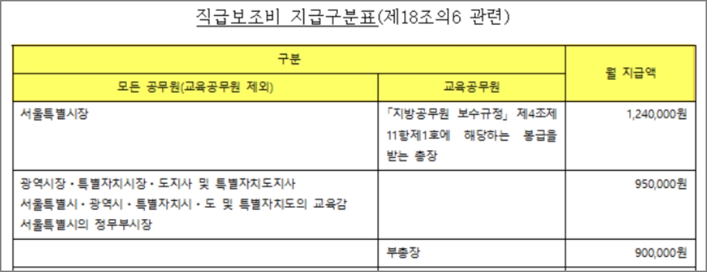 연봉 외에 직급에 따른 직급보조비를 매월 지급합니다. 서울특별시장의 직급보조비는 매월 1,240,000원입니다. 경기도 지사의 경우는 950,000원입니다. ▼ 2022년 공무원 직급보조비 인상