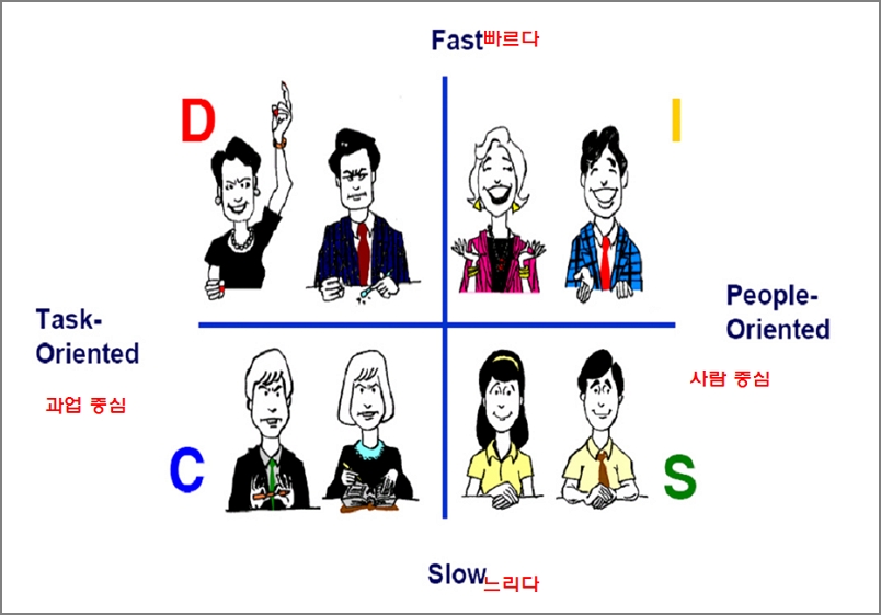 D형-주도형(빠르고, 과업중심형), I형-사교형(빠르고, 사람중심형), S형-신중형(느리고, 사람중심형), C형-안정형(느리고, 과업중심형)