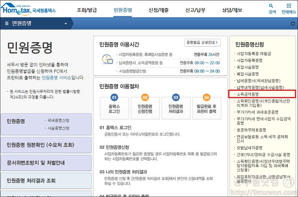 ▼ 우측 민원증명신청에서 소득금액증명을 클릭합니다.
