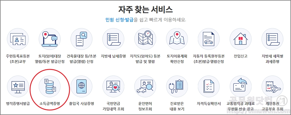 ▼ 자주찾는 서비스에서 소득금액증명을 클릭합니다.