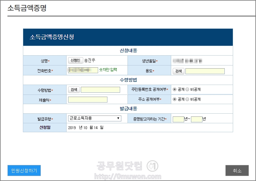▼ 소득금액증명신청서를 작성합니다. 신청인, 생년월일, 용도, 수령방법, 주민등록번호 공개여부, 제출처, 주소 공개여부, 발급유형, 증명받고자하는 기간 등을 작성 후 신청하기 버튼을 클릭 후 발급을 받으면 됩니다.