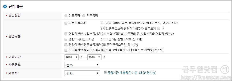 소득금액증명신청서는 근로소득자용, 연말정산한 사업소득자용, 연말정산한 종교인소득자용, 연말정산한 연금소득자용, 종합소득세신고자용 소득금액증명 발급이 가능합니다.