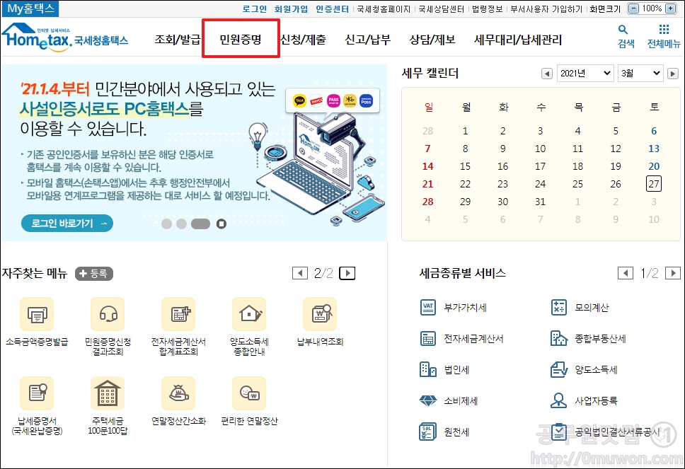 ▼ 국세청홈택스에 접속을 합니다. 민원증명을 클릭합니다.