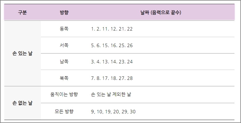 손 없는날은 방향에 따라 손 있는날을 제외한 날과 방향과는 상관 없이 귀신이 활동하지 않는 음력으로 끝수가 9와 0일인 날, 즉 9일과 10일, 19일과 20일, 29일과 30일이 해당이 됩니다.