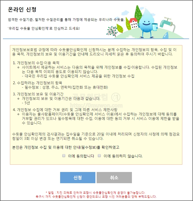 우리집 수돗물 안심확인제 무료 수질검사 신청방법 및 절차를 알아보겠습니다. 서울시 수돗물, 인천시 수돗물, 부산시 수돗물, 광주시 수돗물, 대구시 수돗물, 울산시 수돗물, 대전시 수돗물 등 특광역시 뿐만 아니라, 경기도, 제주도 등 기타 전국이 가능합니다.