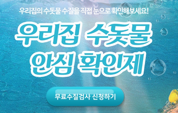 우리집 수돗물 수질이 궁금하다면 한번 수질검사를 신청해보시기 바랍니다. 엄격한 수질기준, 철저한 수질관리를 통해 가정에 공급되는 우리나라 수돗물, 우리집 수돗물 안심확인제로 수질확인하고 안심하고 마음껏 드세요.