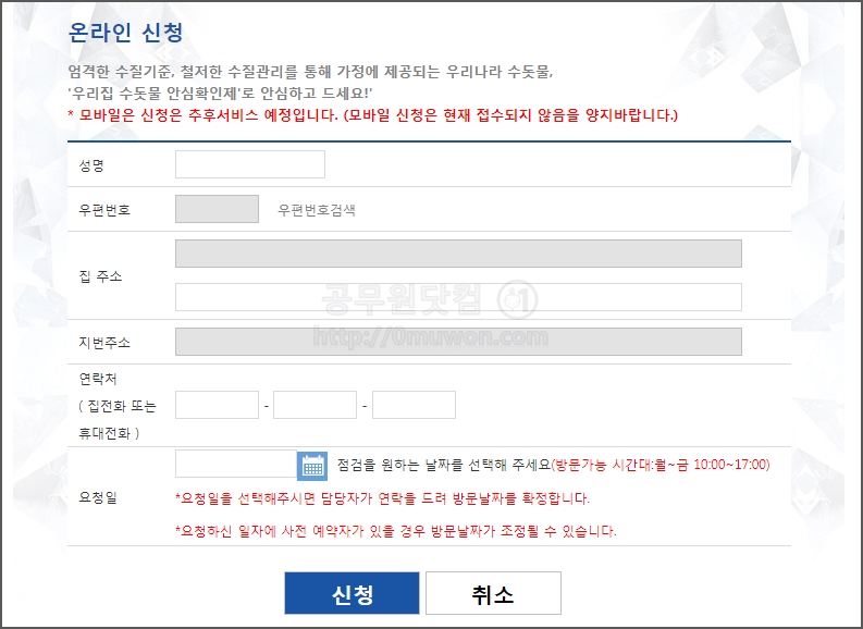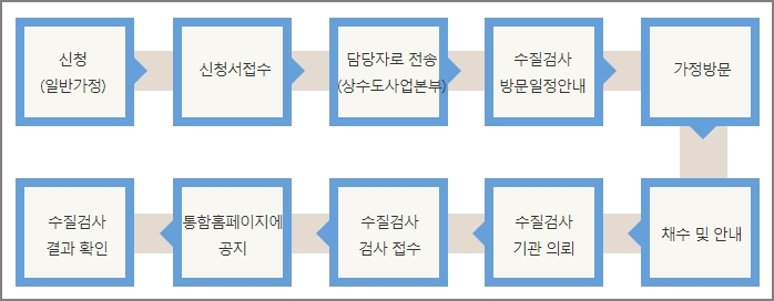 수돗물에 대한 막연한 불안감을 해소하고 수돗물의 음용률과 신뢰도를 높이기 위해, 가정에 직접 방문하여 수돗물 수질을 검사해주는 제도입니다.