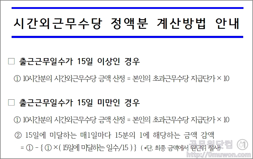 시간외근무수당 정액분은 정규 근무일을 기준으로 월간 출근(또는 출장) 근무일수가 15일 이상인 공무원에게 지급이 됩니다. 즉, 근무일수가 15일 이상이 되어야 합니다. 만약, 그 달에 근무일수가 15일 미만이면 1일에 1/15씩 감액을 하여 지급을 하게 됩니다.
